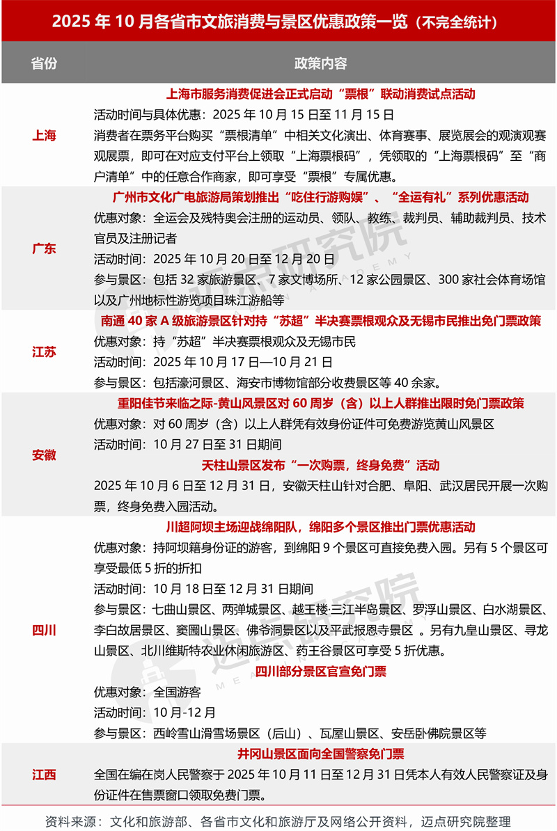 2025年10月,国庆中秋双节开局、重阳节收尾,苏超、川超等热门体育赛事火热进行,第十五届全运会有序筹备。以上海、广州、南通、阿坝州、黄山等城市为代表,各地借助展会、赛事、全民体育盛事、传统节日等推出系列文旅惠民活动,激活景区消费。