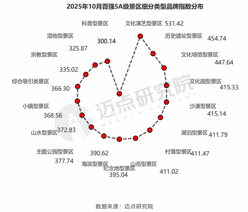 2025年10月,百强5A级景区细分类型品牌指数位列前五的为文化演艺型景区、历史遗址型景区、文化场馆型景区、文化园型景区、沙漠型景区。其中,文化园型景区品牌指数环比增幅最高,达26.12%。如以河南开封清明上河园为代表,10月份,清明上河园持续创新夜间产品《大宋·东京梦华》实景演出、举办第七届国际菊花展,宋文化与菊花融合助力热度延续,景区单月游客接待量突破70万人次,创清园开园20年来历史新高。