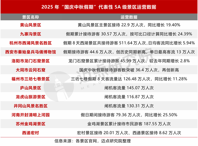 2)“国庆中秋假期”代表性5A级景区运营数据
