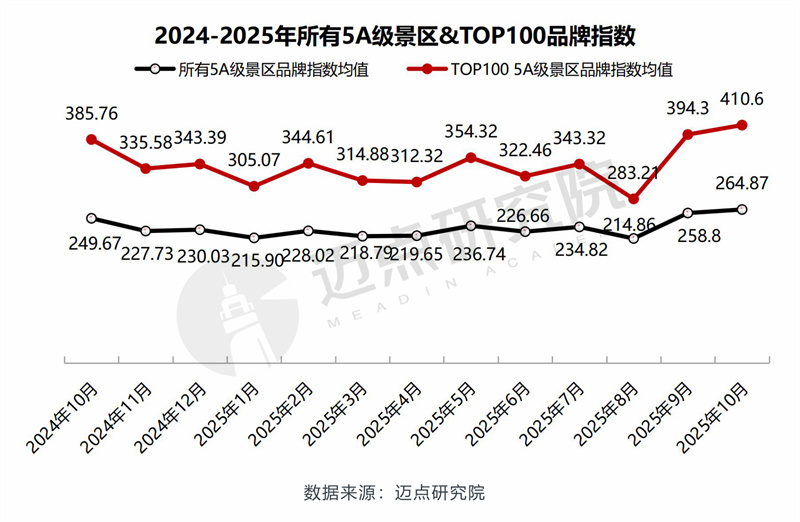 经迈点研究院监测,10月所有5A级景区的品牌指数均值为264.87,环比上升2.35%;100强5A级景区MBI品牌指数均值为410.60,环比增长4.13%。本月,受国庆中秋黄金周、重阳节、地方赛事等助推,以5A级景区为代表与引领,各地景区加大宣传推广力度、创新业态与产品、举办主题活动、推出促消费惠民政策等,所有5A级景区与百强景区品牌指数环比均呈增长态势。