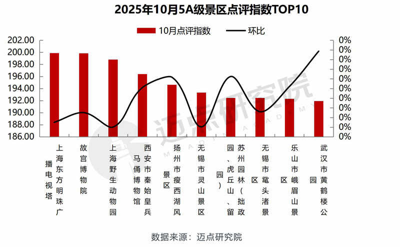 10月整体5A级景区品牌点评指数均值为167.16,环比微涨(0.08%);TOP100 5A级景区品牌点评指数均值为177.67,环比下降0.30%。本月,5A级景区中点评指数前十的分别是:上海东方明珠广播电视塔、故宫博物院、上海野生动物园、西安市秦始皇兵马俑博物馆、扬州市瘦西湖风景区、无锡市灵山景区、苏州园林(拙政园、虎丘山、留园)、无锡市鼋头渚景区、乐山市峨眉山景区、武汉市黄鹤楼公园。与上月相比,各景区点评指数相对稳定,增幅相对明显的为武汉市黄鹤楼公园。携程平台数据显示,武汉市黄鹤楼公园点评量达7万条,为携程2026亚洲100必打卡景区,连续四年入选年度榜单,上榜理由为“夜观黄鹤楼灯火辉煌”,景区夜游体验升级深受游客好评。