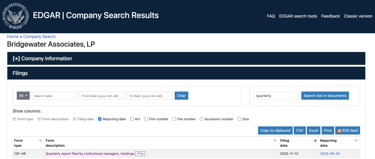 根据桥水联合公司(Bridgewater Associates,桥水)于11月14日向美国证券交易委员会(SEC)提交的13F持仓报告,截至2025年9月30日的三季度末,该基金整体持仓市值约为255亿美元,较二季度末的248亿美元小幅增长。报告显示,桥水在该季度增加了325个证券的持仓,减少了194个证券的持仓,新建了493个仓位,并清仓64个证券。