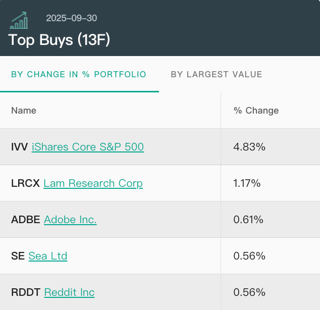 科技股减持比例最高,涉及“Magnificent Seven”中的多家巨头,减持规模占总变化的显著部分。其中,对NVIDIA (NVDA)减持472万股,剩余持仓251万股,而二季度曾加码154%;对Alphabet (GOOGL)减持52.7%,市值减少82亿美元;对Microsoft (MSFT):减持36%,市值减少61亿美元。