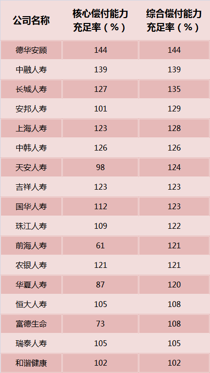 根据保监会要求,保险公司综合偿付能力充足率与核心偿付能力充足率分别需达到100%、50%以上,才算达标。因此,业内通常把综合偿付能力充足率或核心偿付能力充足率分别在150%以及100%以下的公司看作是偿付能力临踩线的公司。界面新闻整理出17家综合偿付能力充足率在150%以下的寿险公司,见下表。