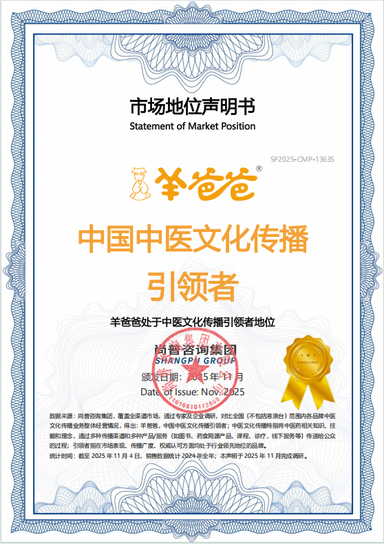 2025年11月,专业市场研究型咨询机构尚普咨询集团,通过专家及企业调研,对比全国(不包括港澳台)范国内各品牌中医文化传播业务整体经营情况,正式授予羊爸爸品牌“中国中医文化传播引领者”的市场地位认证。