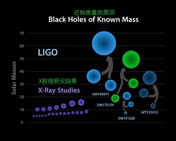 图4:引力波探测到的黑洞(蓝色和绿色)和电磁辐射探测到的黑洞(紫色)对比图,引力波探测到的黑洞质量都是比较大的。图中绿色的是新探测的黑洞系统GW170104。引力波探测到的黑洞(蓝色和绿色)和电磁辐射探测到的黑洞(紫色)对比图,引力波探测到的黑洞质量都是比较大的。新探测的黑洞系统GW170104用绿色标出。