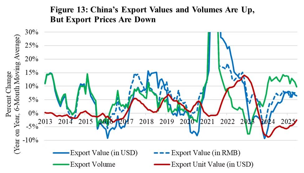 根据PRC Leader基于海关总署数据的分析显示,过去一年,中国出口量增长与出口单价增长之间的差距达到了十多年来的最大水平。[1]这意味着,许多中国企业仍在依靠“以价换量”维持增长,“规模扩张”与“健康增长”之间的矛盾日益尖锐。