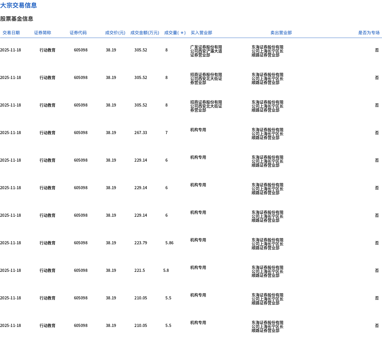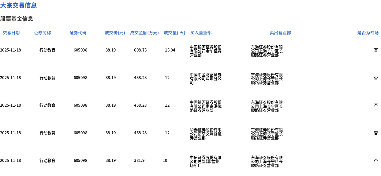 11月18日,行动教育大宗交易成交133.6万股,成交额5102.19万元,占当日总成交额的66.66%,成交价38.19元,较市场收盘价41.4元折价7.75%。