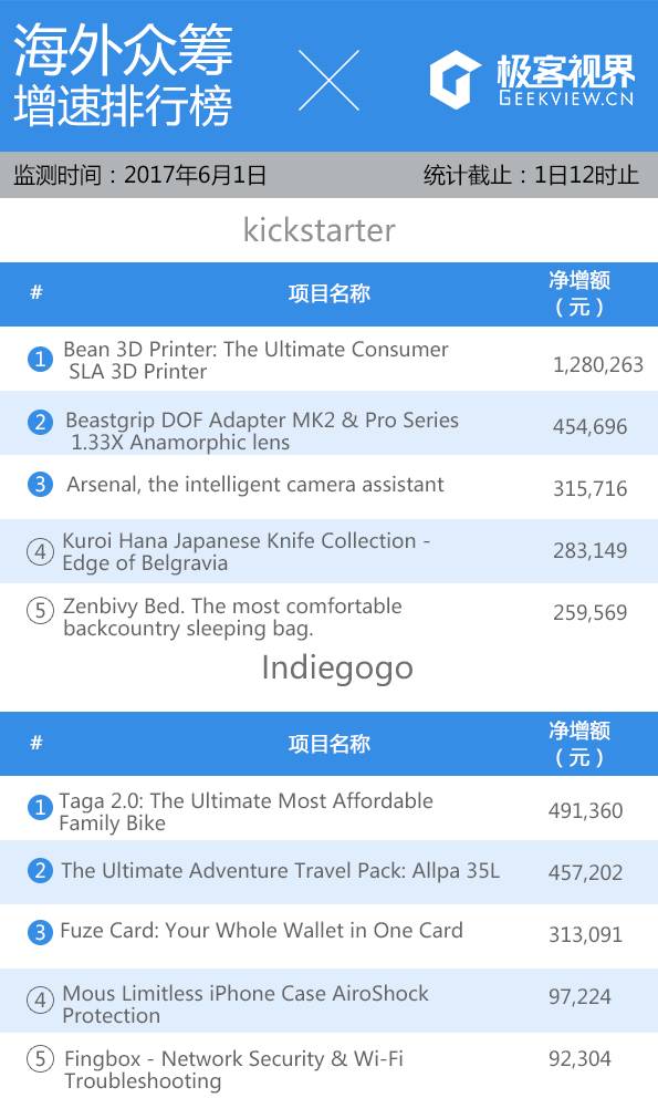 今天 Kickstarter 今天新上榜第一名的是桌面Bean 3D 打印机,今天共筹得 1,280,263 RMB。