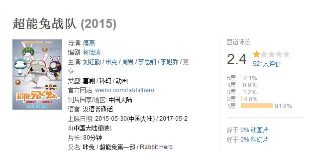 《超能兔战队》两年前第一次出街的成绩已经十分凄惨,评分只有2.4分,票房仅有158万票房。但口碑和票房基本成正比,又恰巧说明了这确实是一部“烂片”。