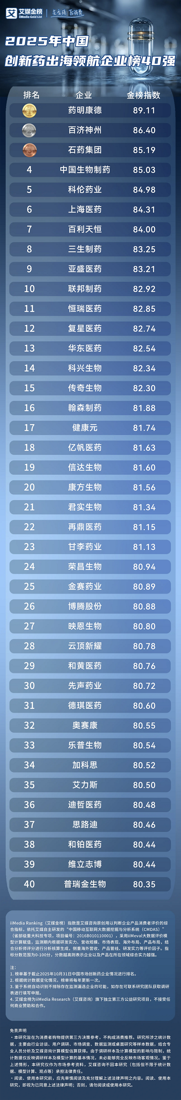 iiMedia Ranking(艾媒金榜)是艾媒咨询旗下中国新消费品牌评价机构,为消费者提供客观的品牌信息及购物消费指南。iiMedia Ranking(艾媒金榜)最新发布《2025年中国创新药出海领航企业榜40强》,金榜指数是艾媒咨询原创用以判断企业产品消费者评价的综合指标,依托艾媒自主研发的“中国移动互联网大数据挖掘与分析系统(CMDAS)”(省部级重大科技专项,项目编号:2016B010110001),采用iiMeval大数据评价模型计算赋值,监测期内根据研发实力、营收规模、市场表现、海外布局、产品布局,结合分析师评分进行分析核算生成,侧重海外营收、产品管线、研发实力等评价因子。指标分数范围为0-100分,分数越高则表示企业以及产品在所在领域综合实力越强。