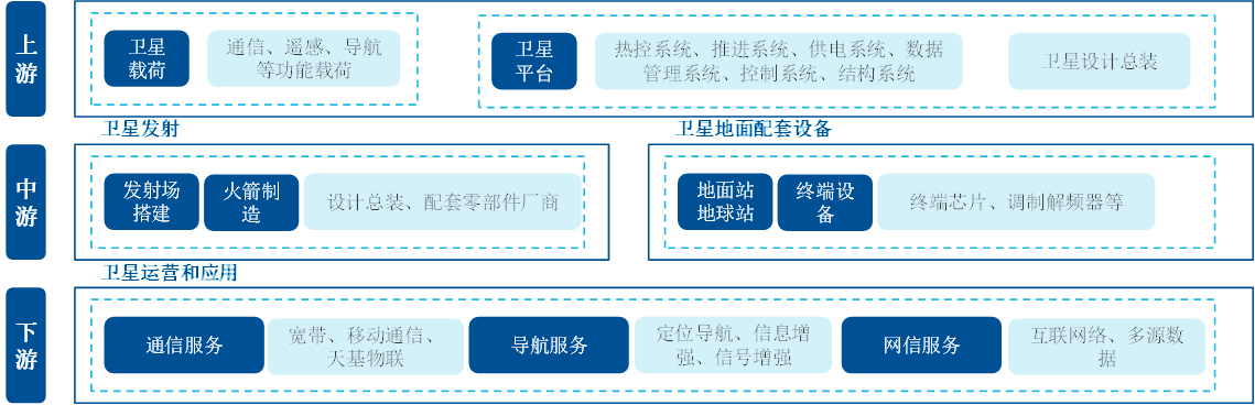 卫星产业链上游主要为卫星制造,核心为载荷制造(承担不同功能的模组),与卫星平台的搭建(卫星整体载体制造),目前上市企业主要为零部件制造相关企业;中游只要涉及卫星发射与地面接收设备,上市企业主要集中在配套设备的电子元器件(如芯片)等环节;下游主要包含运营与应用,直接使用卫星为各类客户提供所需的数据或位置等服务。