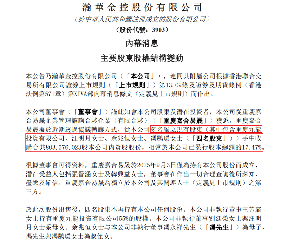9月份,瀚华金控迎来重大股权变更,包括重庆九龙投资有限公司、以及三名自然人股东,将持有的总计8.04亿股份拟转让给重庆嘉合易晟,相当于公司发行股本总额的17.47%,后者将成为瀚华金控第一大股东。