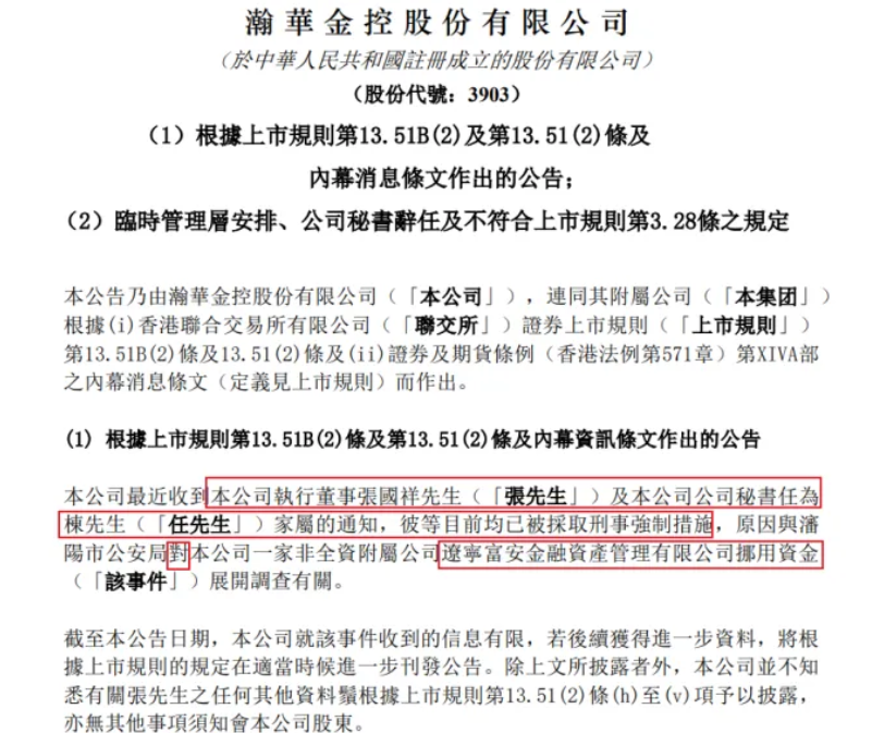 3月25日,根据瀚华金控公告,执行董事张国祥与公司秘书任为栋因涉嫌挪用资金,已被沈阳市公安局采取刑事强制措施。