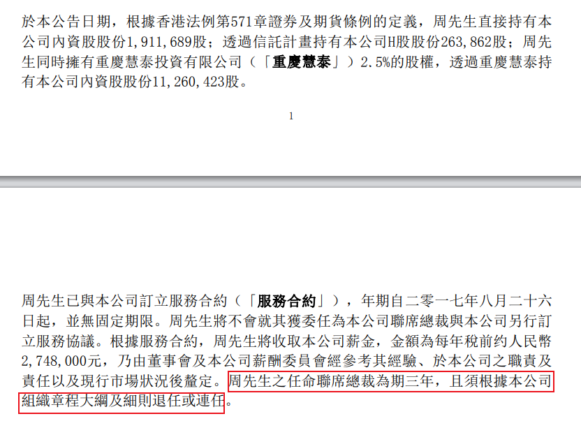 获任联席总裁时,公告显示周小川任职时间三年,后续将根据公司组织章程大纲及细则退任或连任。11月17日,因“个人原因”辞职时,他在联席总裁岗位时间超过三年。