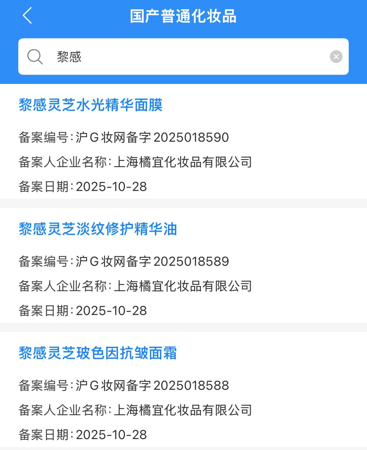 而根据化妆品监管APP,10月,橘宜共备案了3款护肤新品,包括黎感灵芝玻色因抗皱面霜、黎感灵芝淡纹修护精华油、黎感灵芝水光精华面膜,意味着黎感或将重回护肤赛道。