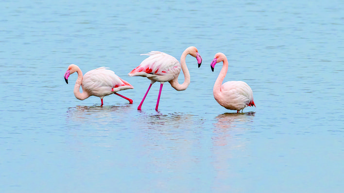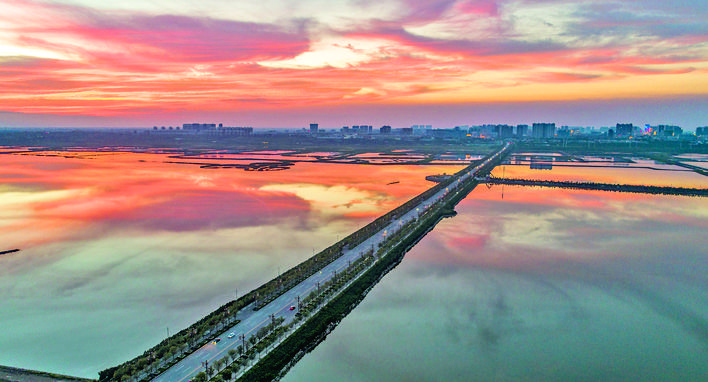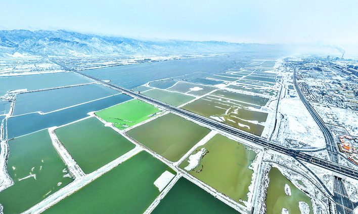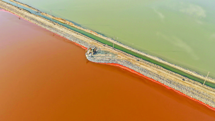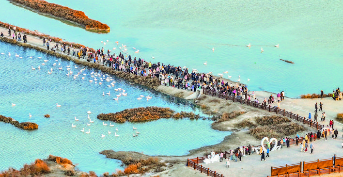 水为脉,“水是眼波横”。在解放南路延长线以西的22号堤埝,芦苇和盐生植物在风中摇曳多姿,火烈鸟和卷羽鹈鹕等水鸟在浅水区悠闲觅食,它们绰约的身影倒映湖中,与周围景色构成一幅美丽的生态画卷。去年冬天,250多只大天鹅在盐湖振翅起舞,这个数字是前年的3倍。同时,火烈鸟、黑腹滨鹬等珍稀鸟类也连续到访,盐湖成为候鸟越冬新乐园。