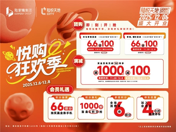 为惊喜加码,陆悦天地还将同步推出一系列精彩会员礼遇。11月28日起,6.6团100、66团100活动将在大众点评上线;满1000减100等礼券将在陆家嘴商业会员小程序上线,涉及零售、餐饮、黄金、数码等多种业态,开启冬日购物狂欢。12月6日起,积分翻倍、积分抽奖、免费停车等福利连番开启,与消费者一同解锁多重喜悦。
