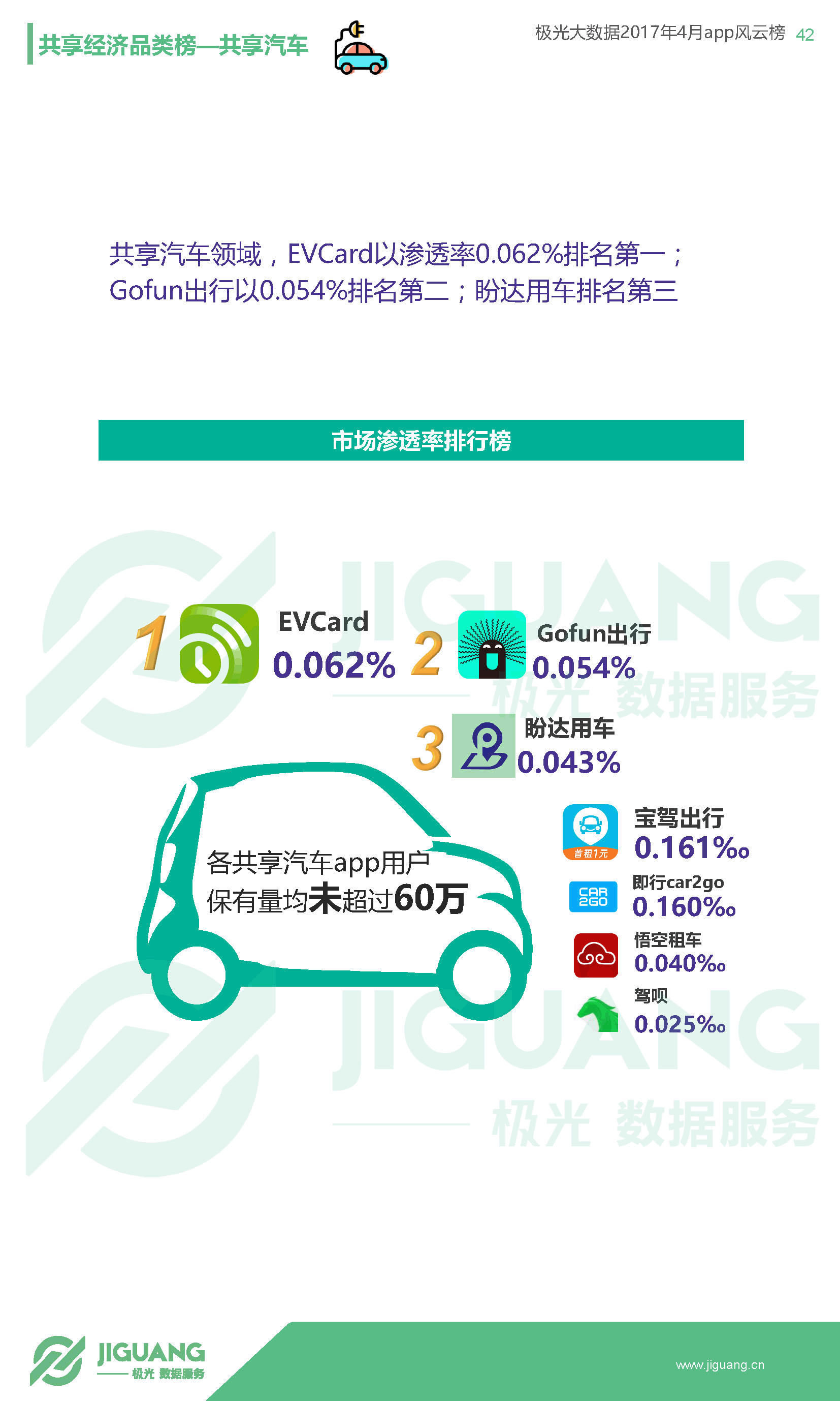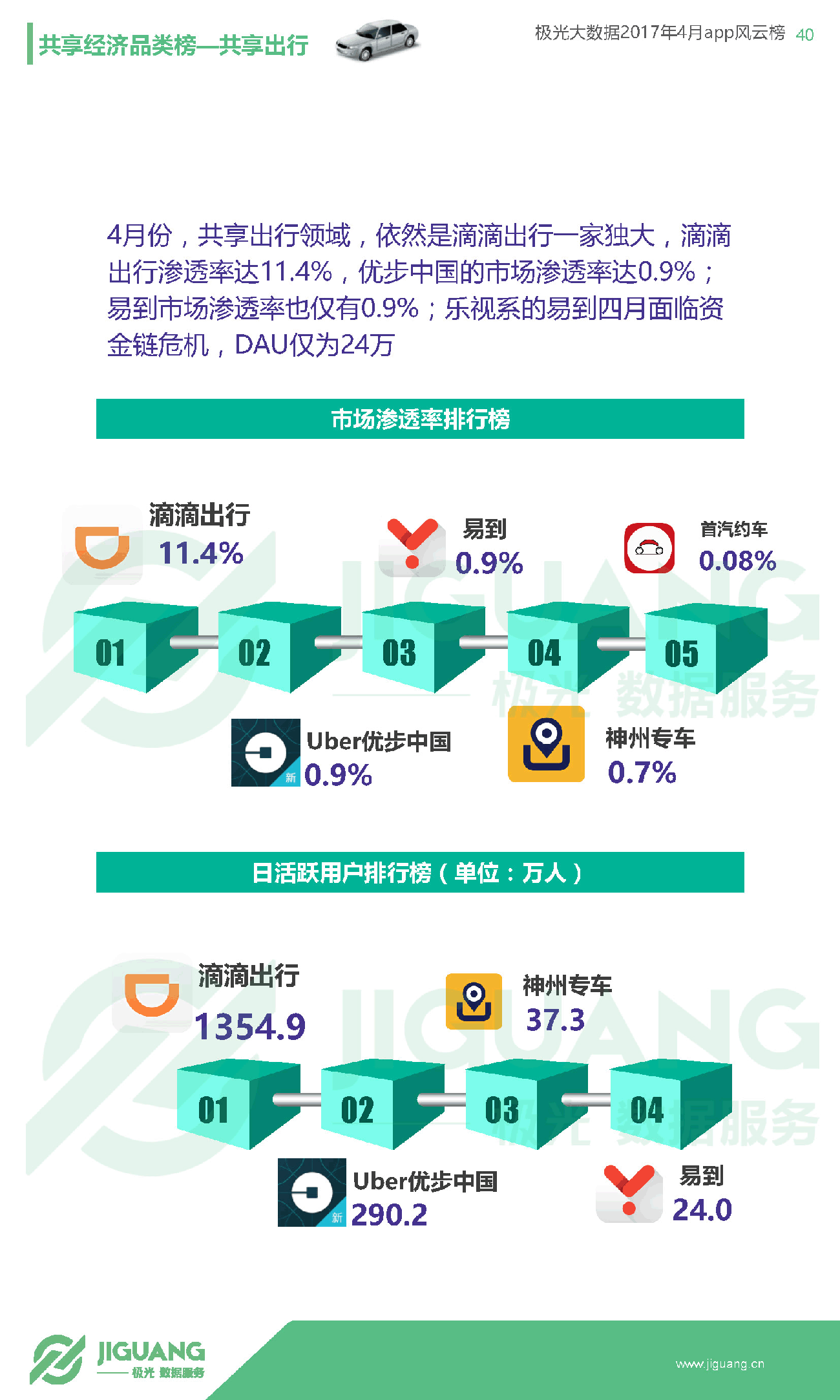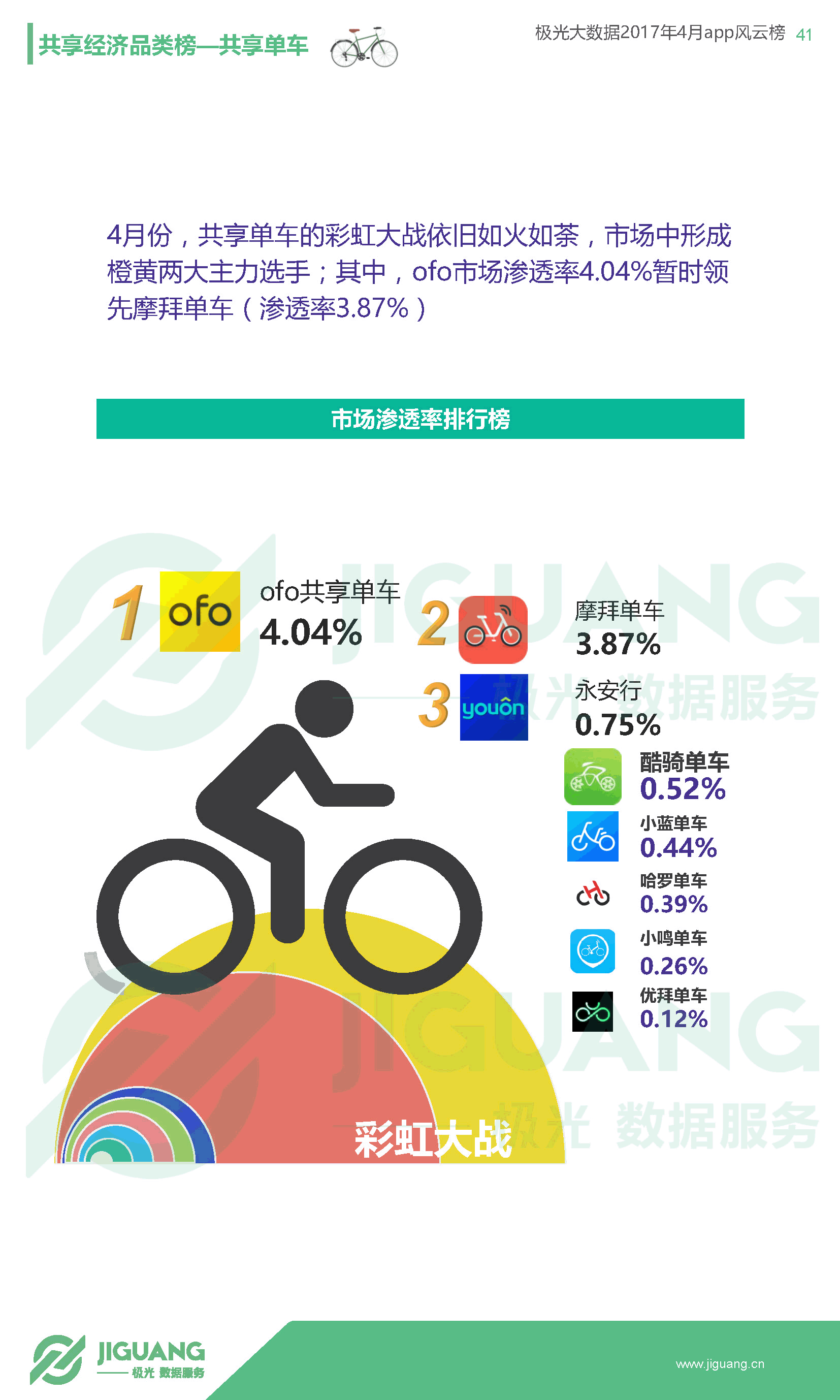 - 共享单车领域由ofo以4.04%的渗透率位居榜首,暂时领先摩拜的渗透率3.87%