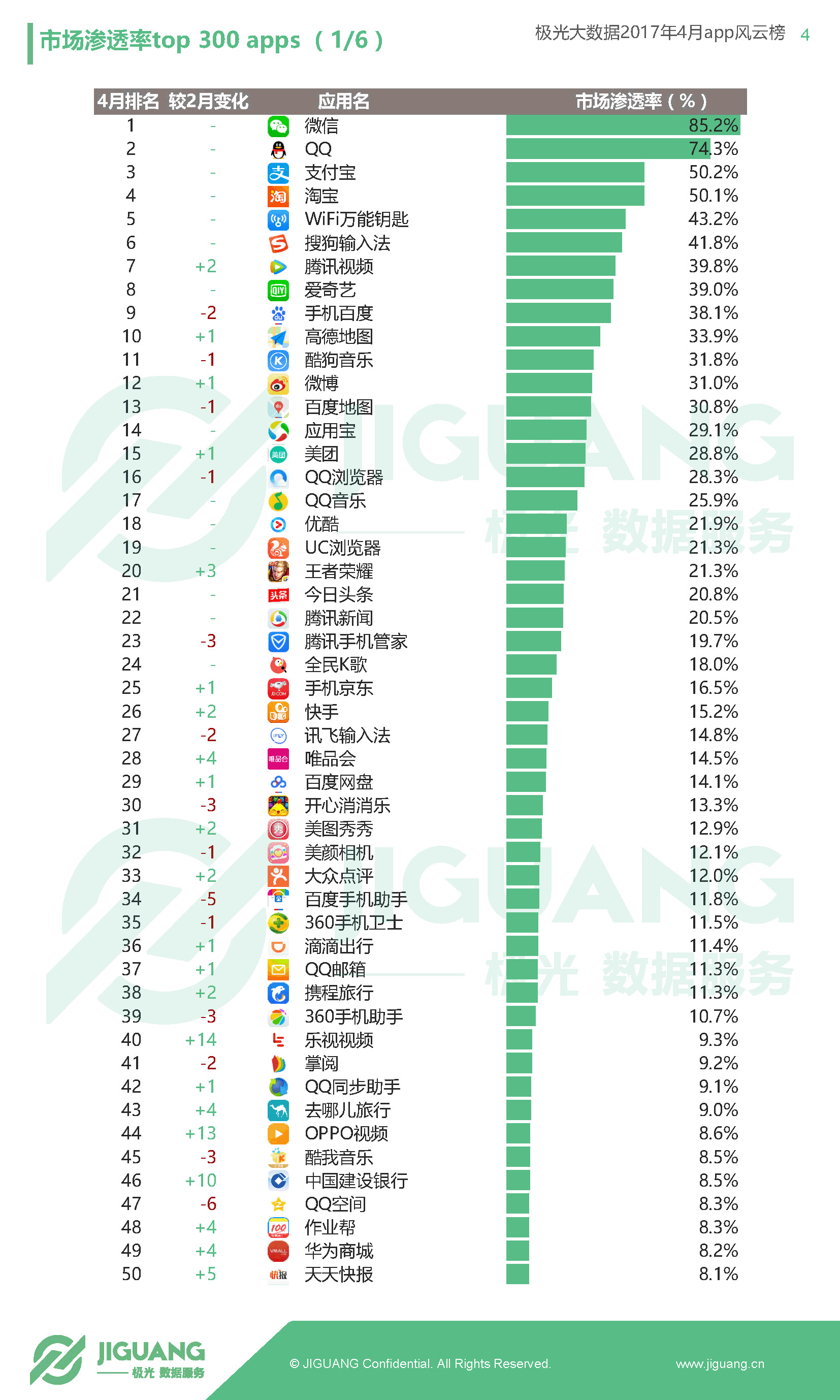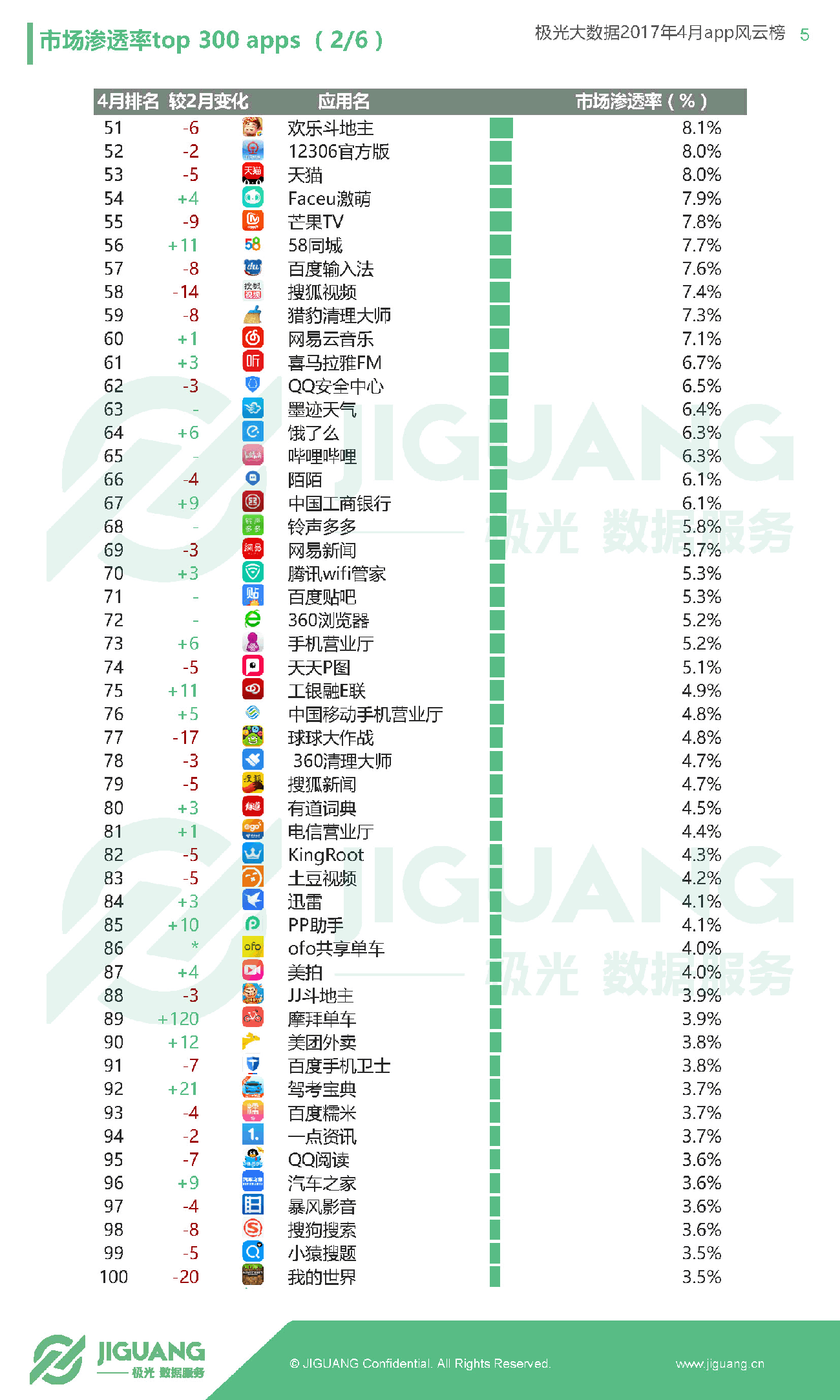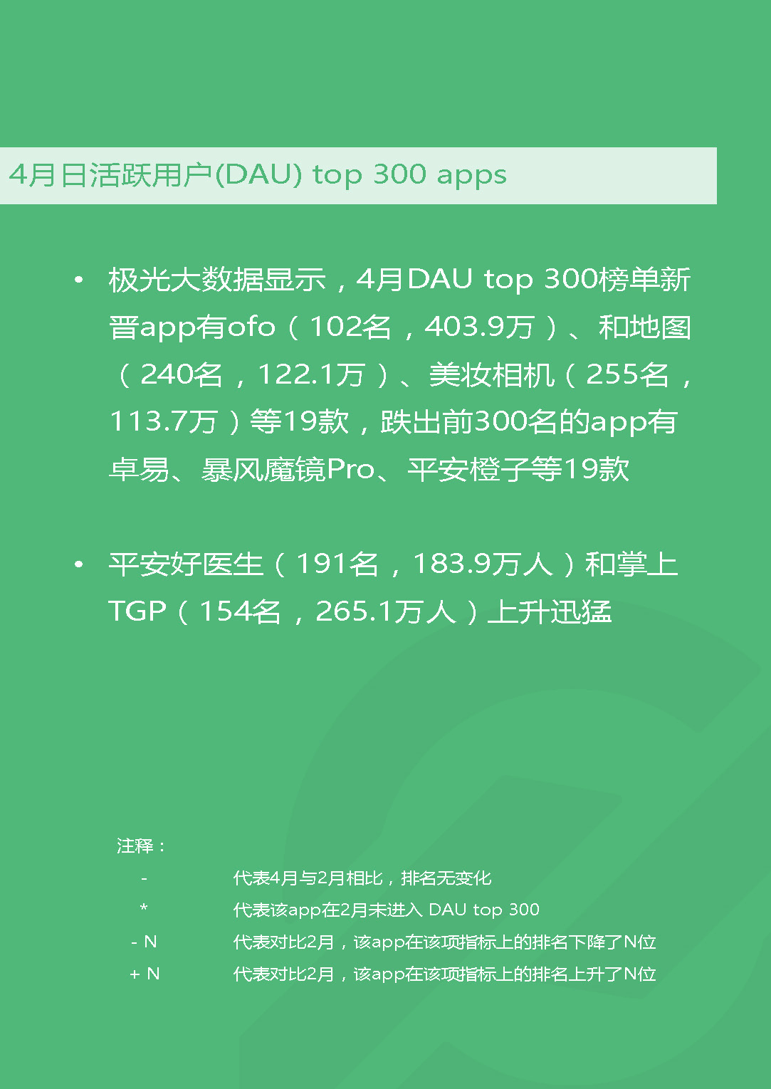 - 共享单车领域由ofo以4.04%的渗透率位居榜首,暂时领先摩拜的渗透率3.87%