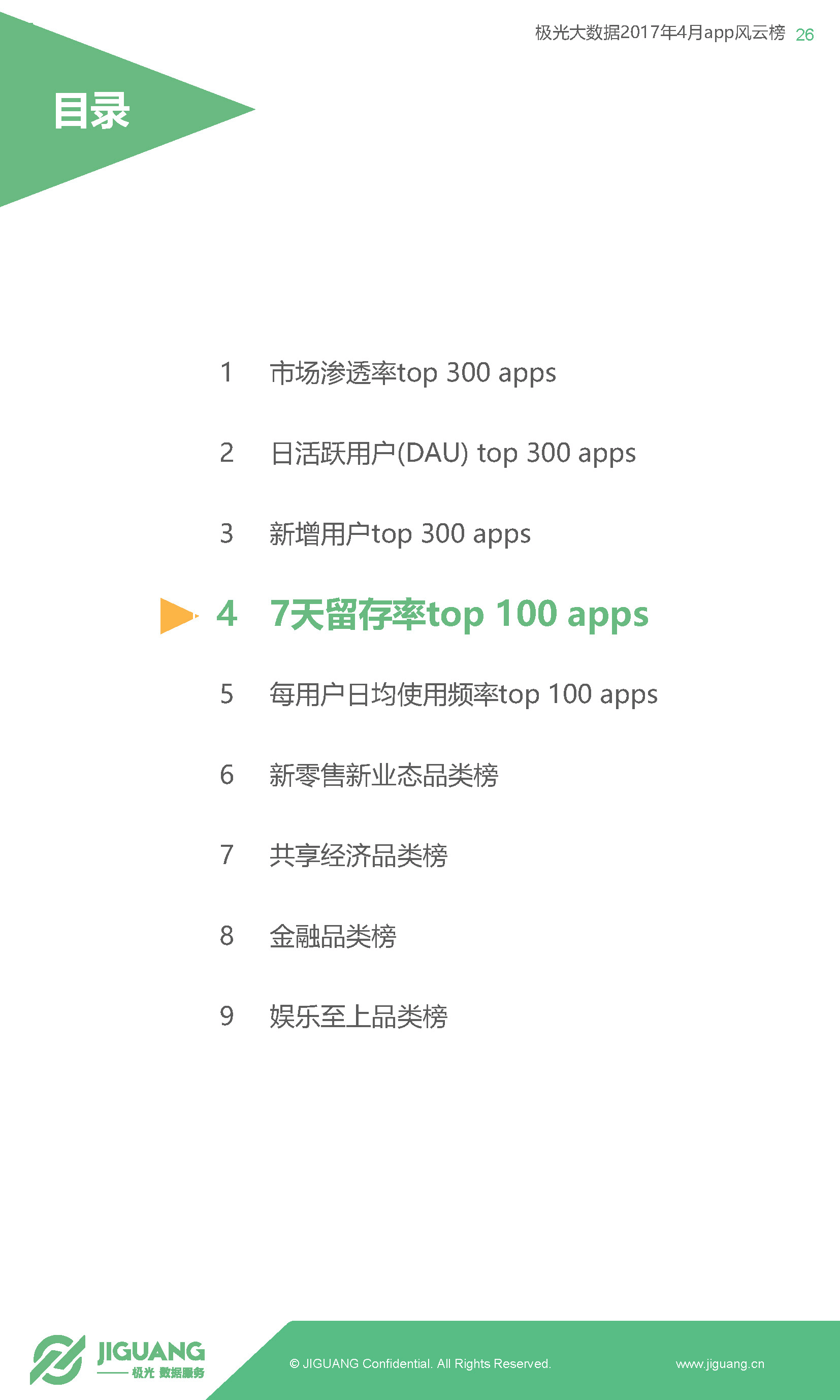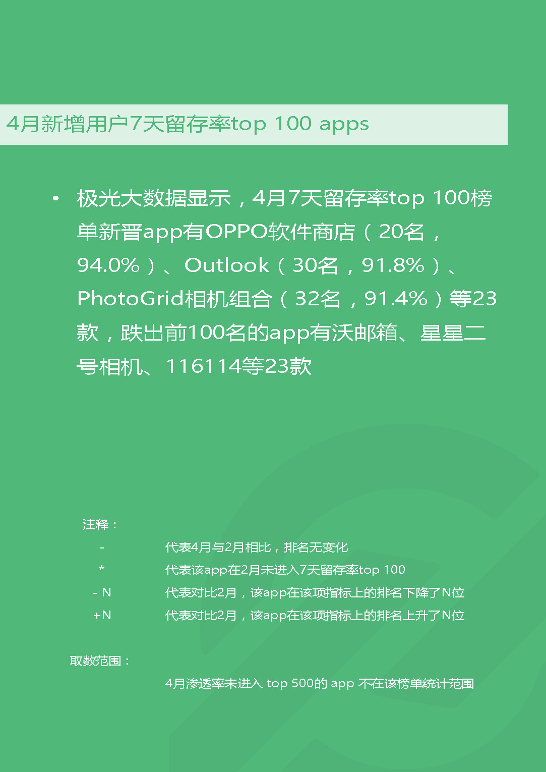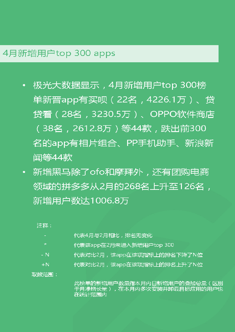 共享单车日渐火爆,ofo与摩拜携手挺进渗透率百强,ofo月新增用户更是达到1830万,远超摩拜的710万,显示出后来居上的势头。银行类App集体走强,中国建设银行渗透率及DAU双双领跑银行类榜单。国内领先的移动大数据服务商极光大数据推出《app风云榜——4月app榜单》,从市场渗透率、日活跃用户、新增用户数、7天留存率等关键指标为您解读国内App的现状。并推出新零售新业态品类榜、共享经济品类榜、金融品类榜、娱乐至上品类榜等分类榜单。
