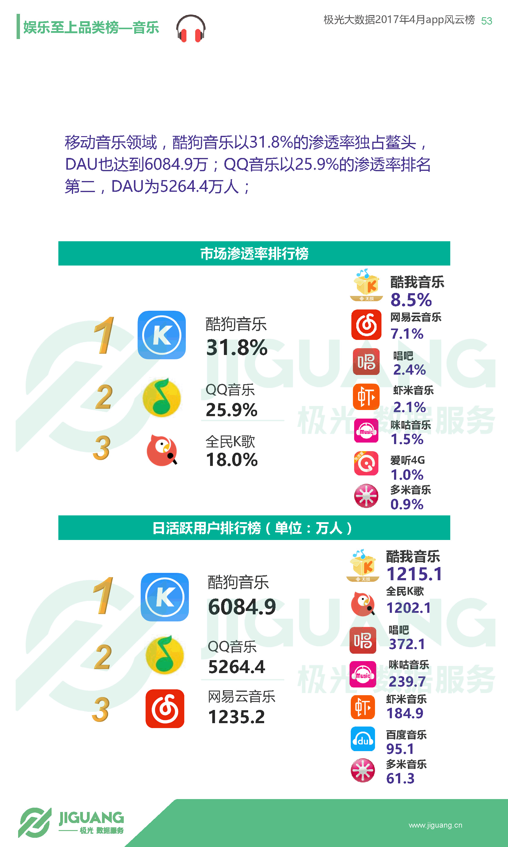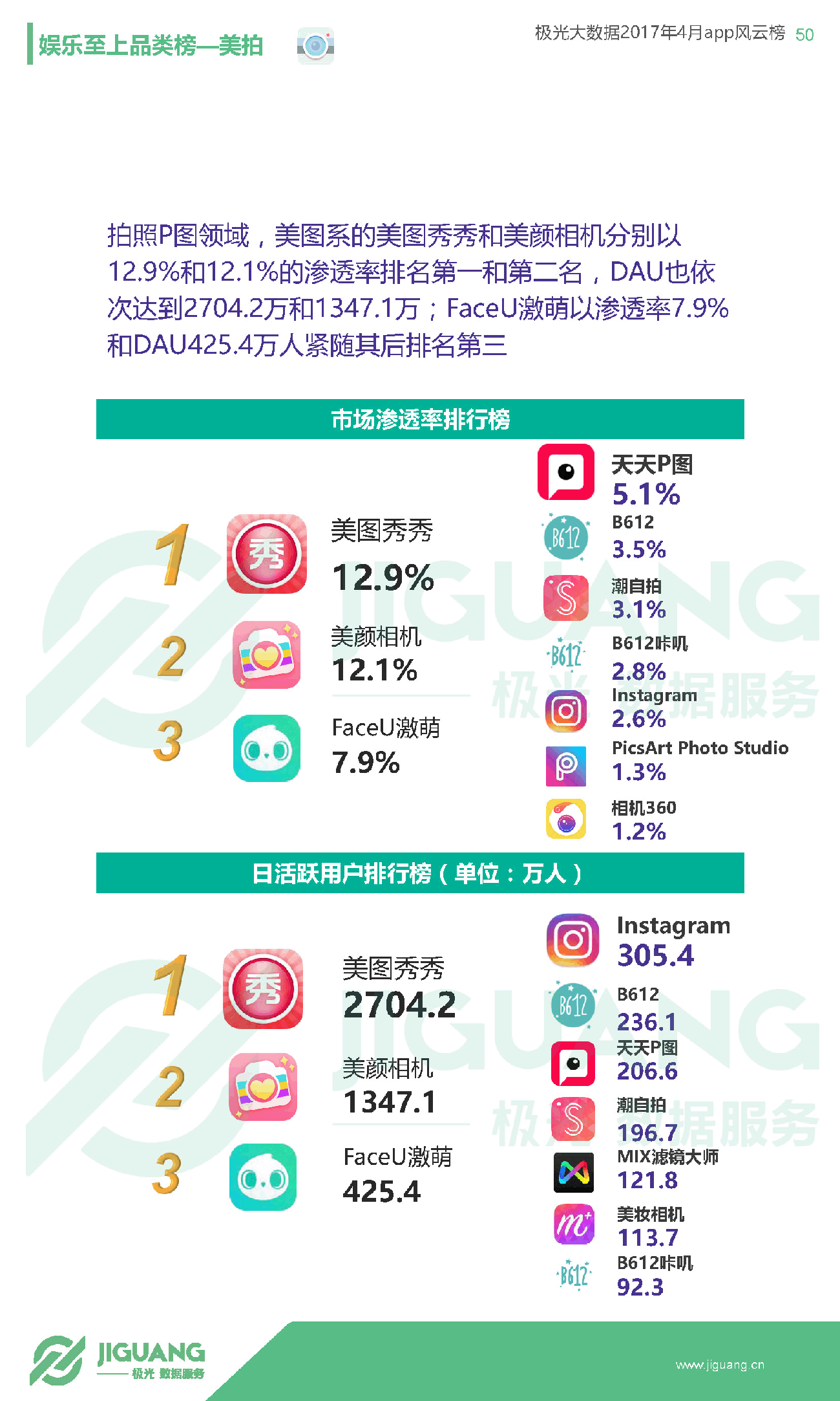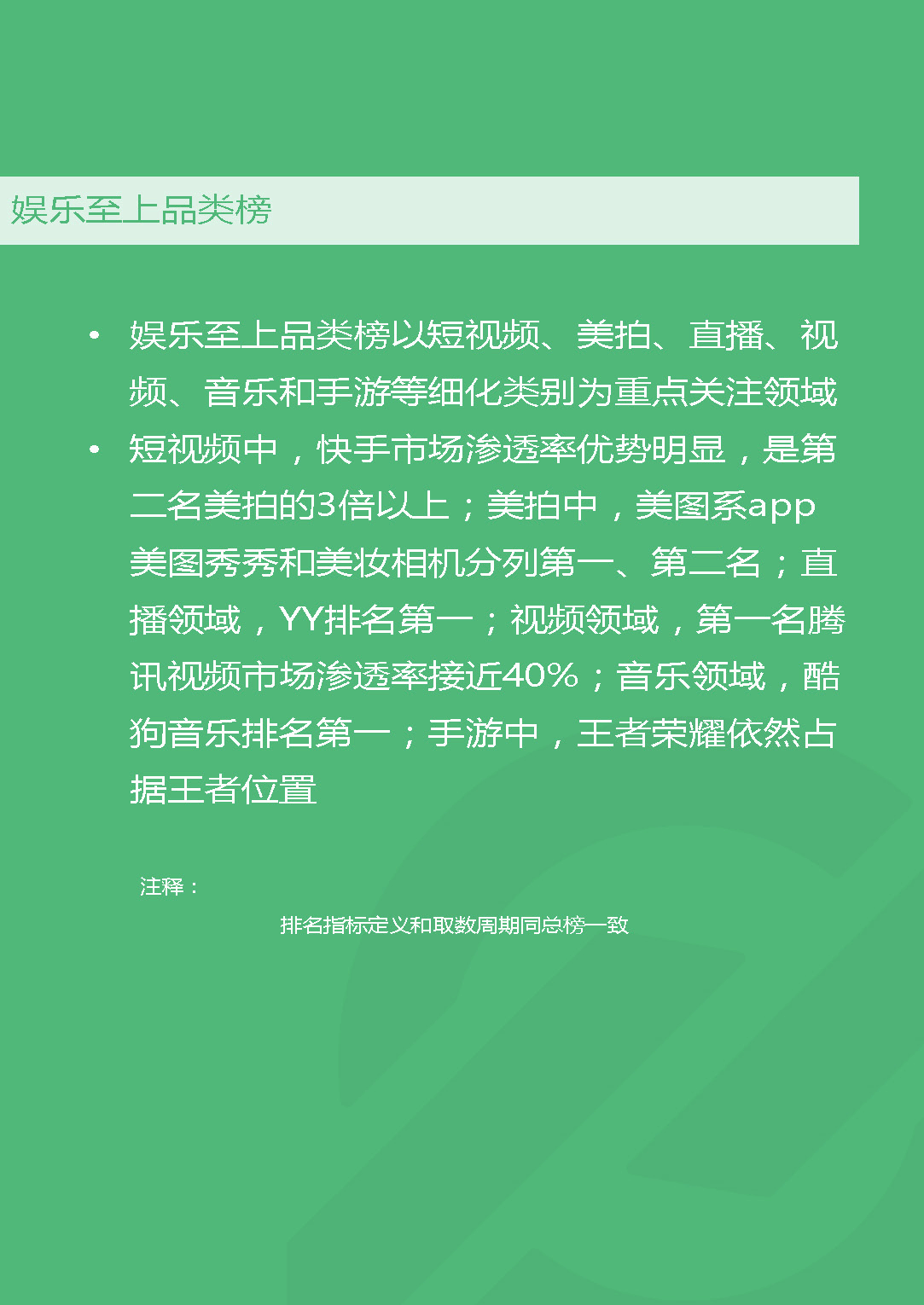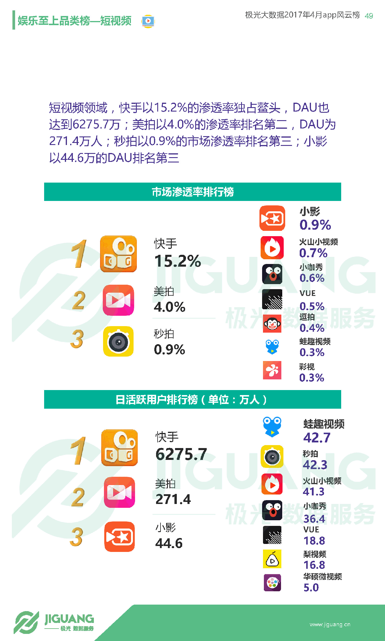 - 短视频方面,快手已势不可挡,渗透率达到15.2%,DAU超过6275万,而该品类排行第二的美拍渗透率仅4.0%,DAU为271.4万