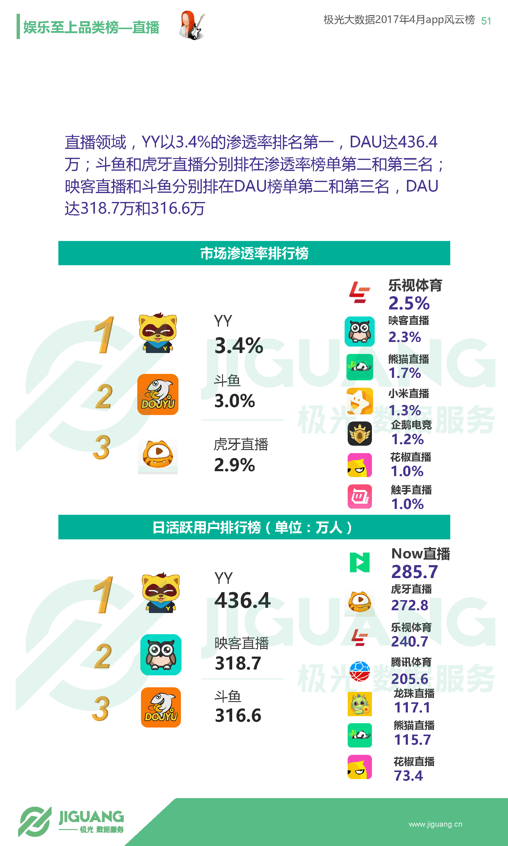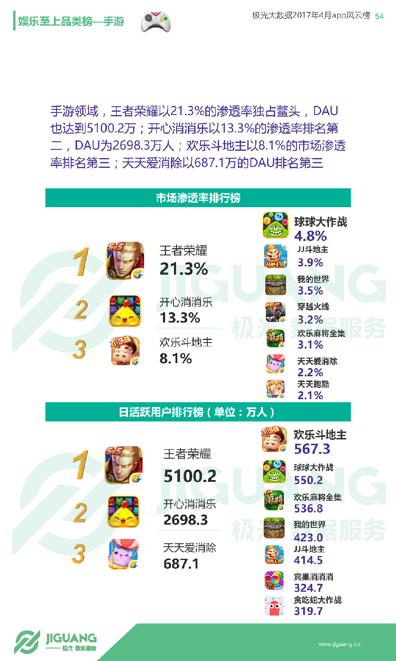 - 手游领域,王者荣耀已经成为国民级手游,渗透率高达21.3%,每五部移动设备就有一部安装了王者荣耀,DAU更是高达5100万,成为当之无愧的全球最热手游