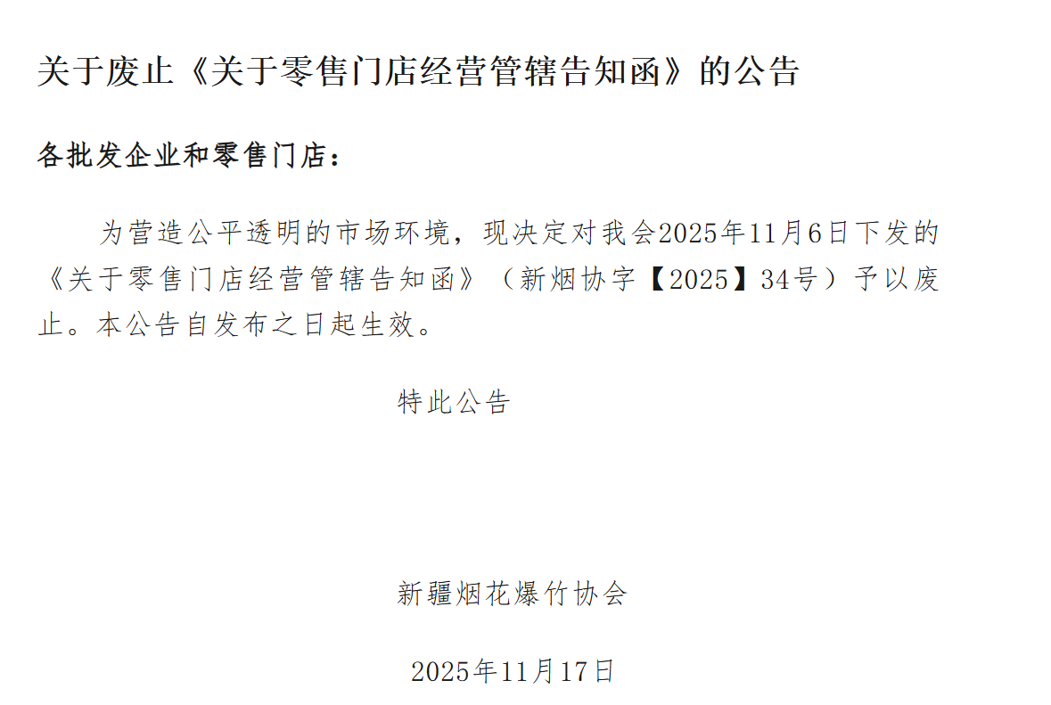 11月20日消息,新疆烟花爆竹协会公告称,为营造公平透明的市场环境,现决定对我会2025年11月6日下发的《关于零售门店经营管辖告知函》(新烟协字【2025】34号)予以废止。本公告自发布之日起生效。