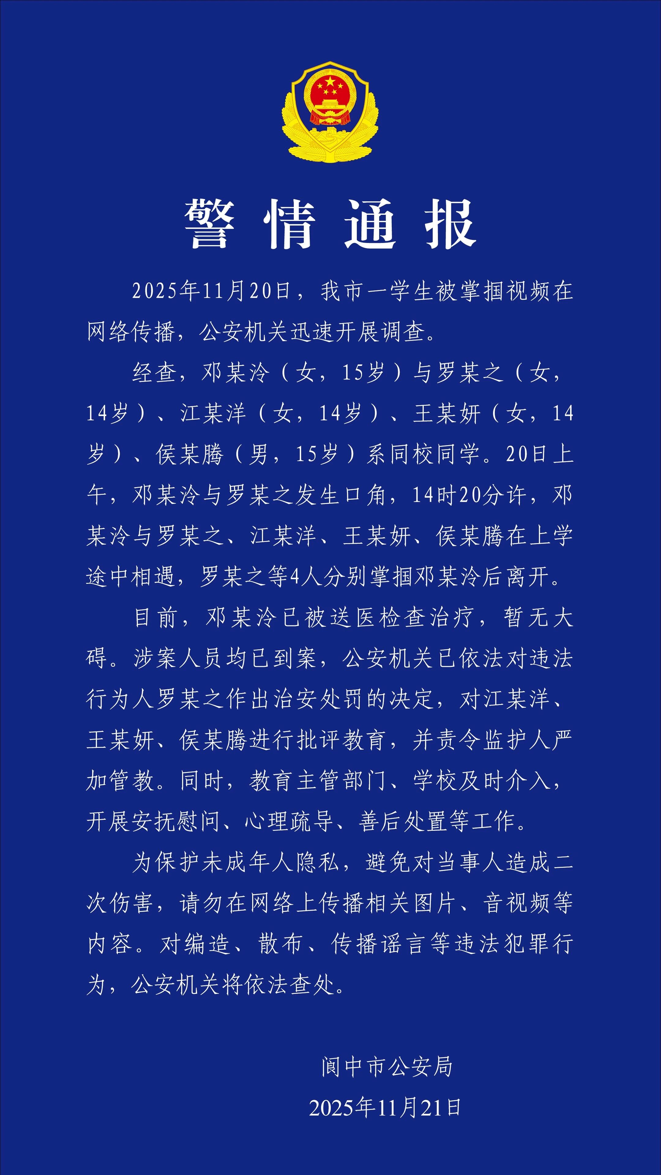 四川阆中市公安局11月21日发布警情通报:2025年11月20日,我市一学生被掌掴视频在网络传播,公安机关迅速开展调查。