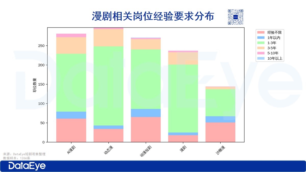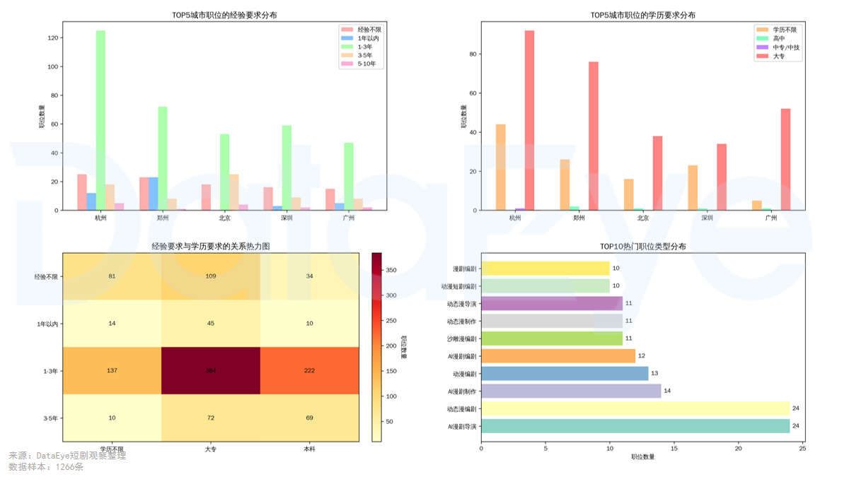 DataEye短剧观察抓取了某招聘平台上的1266条全国漫剧相关的职位招聘记录,涵盖5个核心维度:城市、职位、地区、经验要求、学历要求,真实数据拆解漫剧赛道的产业格局、机会窗口与人才刚需!