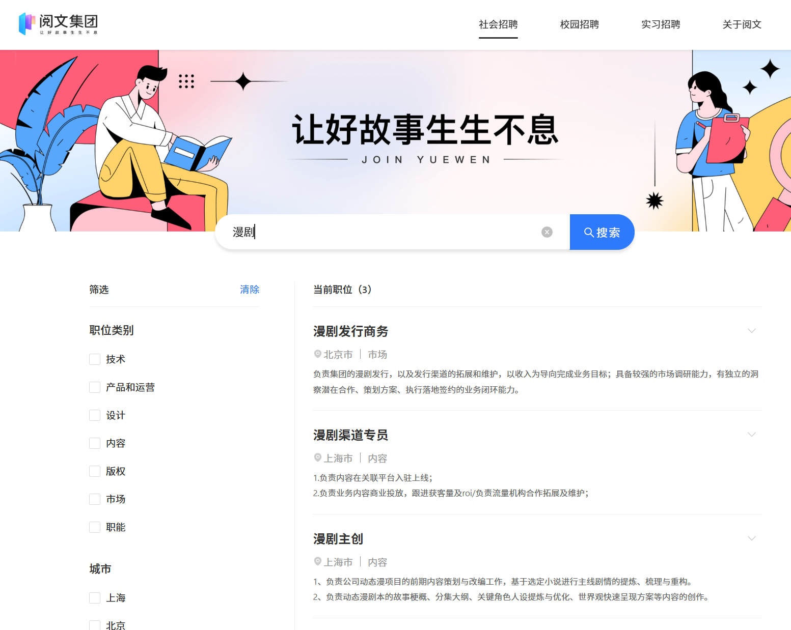 阅文和七猫两大内容普通平台则主打“IP商业化落地”,岗位集中于商务渠道与内容主创上,体现其 “网络小说IP漫改+渠道发行” 的核心优势。释放出的岗位主要包括发行商务、漫剧渠道专员、以及漫剧主创。