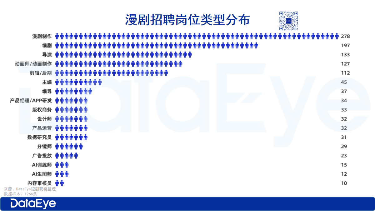 从抓取的1266条职位招聘数据来看,AI漫剧和动态漫相关的职位占比均超23%,是目前核心的漫剧业务类型。