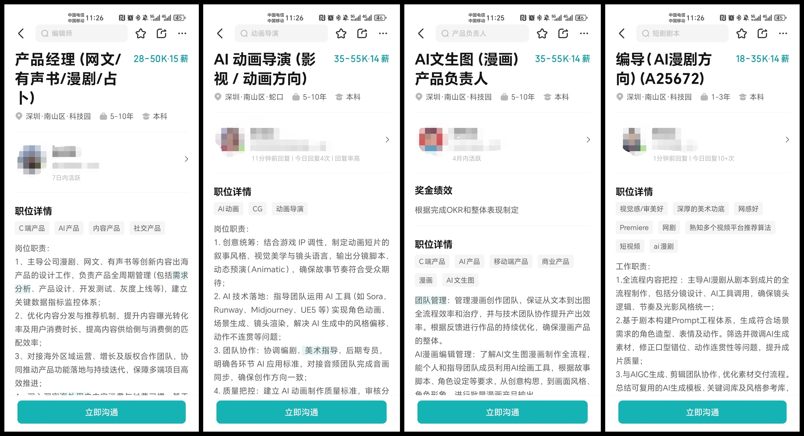 深圳依托强大的互联网技术生态,成为漫剧赛道的“技术创新策源地”。以漫剧APP研发、AI工具训练为主的产品经理和AI训练师等岗位超40个,85%以上集中在深圳,核心聚焦AI漫剧工具、分发平台的研发,技术型人才在这里拥有广阔发展空间。