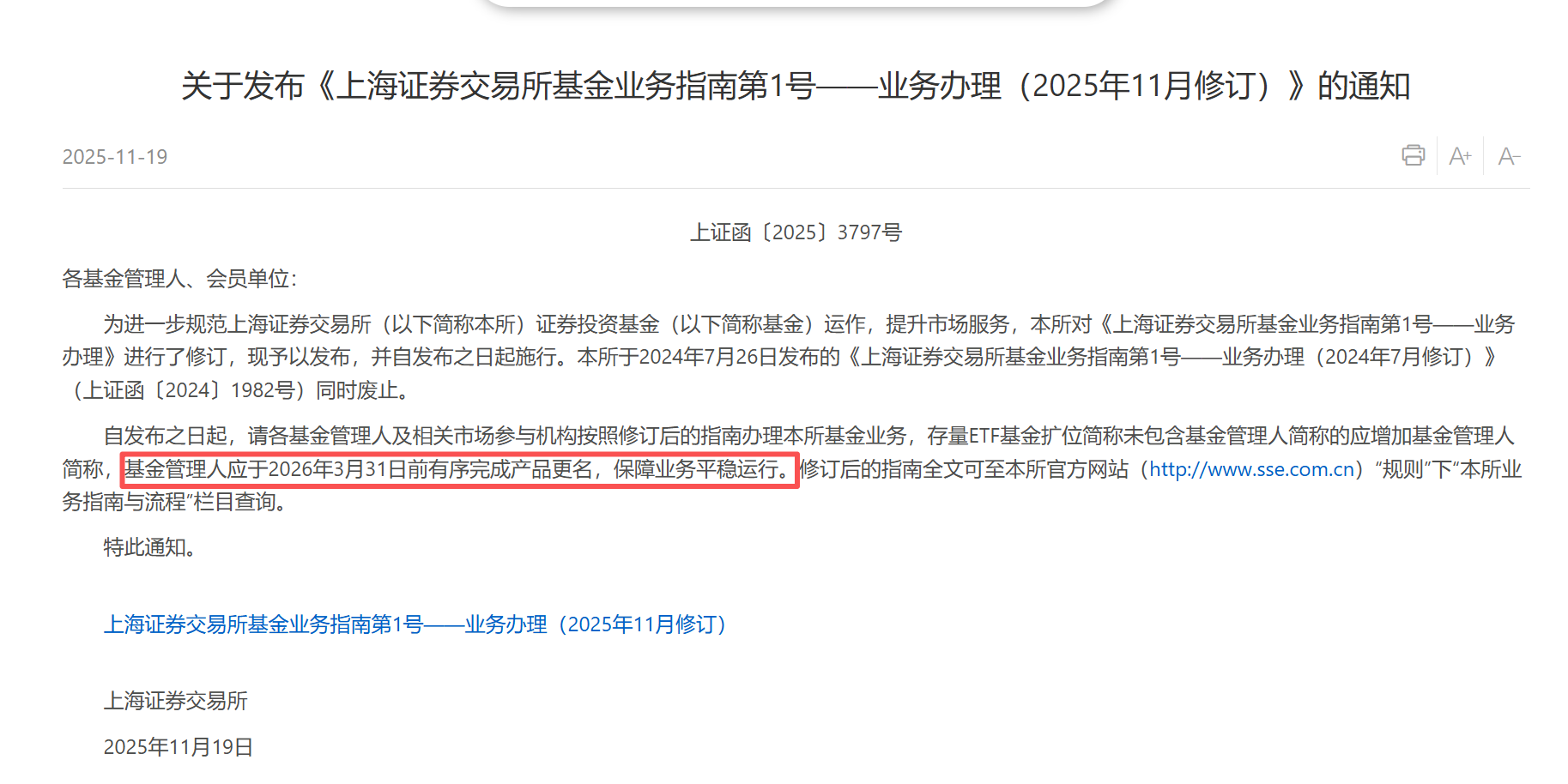 11月19日晚间,沪深两市交易所分别发布了《上海证券交易所基金业务指南第1号——业务办理(2025年11月修订)》、《深圳证券交易所证券投资基金业务指南第1号——相关业务办理(2025年修订)》(以下统称《业务指南》),对存量ETF名称进行统一规范。