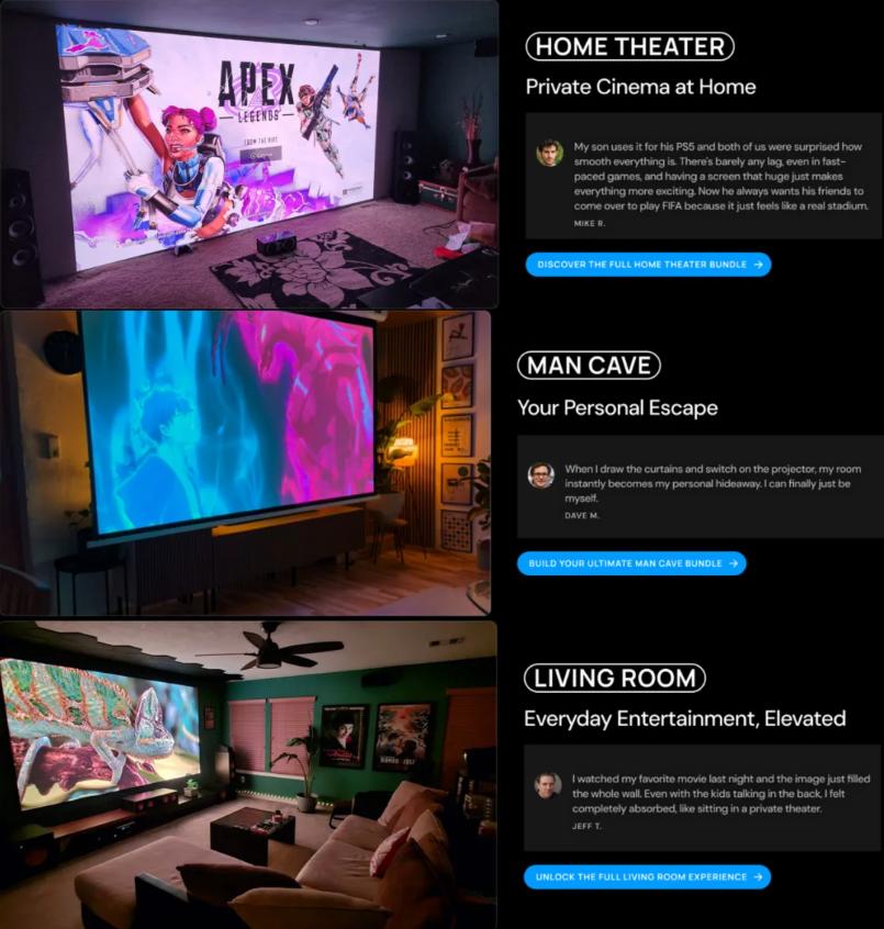 问题是,大屏电视动辄上万美元,且体积庞大、搬运困难,根本无法穿越许多美国家庭的门框和楼梯;而传统高端投影仪虽画质出色,却往往需要更复杂的安装,且白天必须拉上窗帘才能清晰成像。