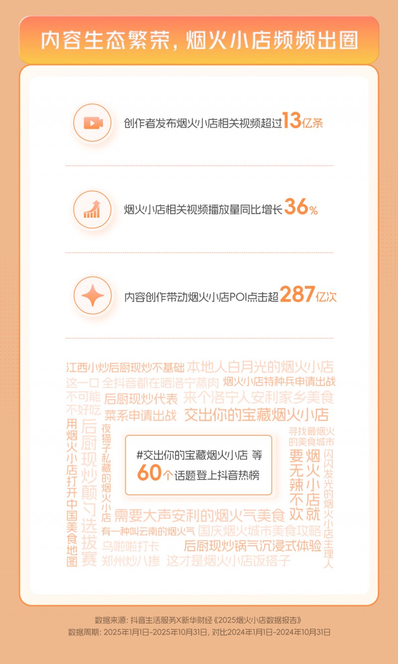繁荣的内容生态,正成为众多烟火小店“出圈”的重要推手。据抖音数据显示,今年1月至10月,超过275万家烟火小店借助创作者发布的内容实现了生意增长。同期,该平台创作者共发布与烟火小店相关视频超13亿条,播放量同比增长36%,并带动POI点击量突破287亿次。