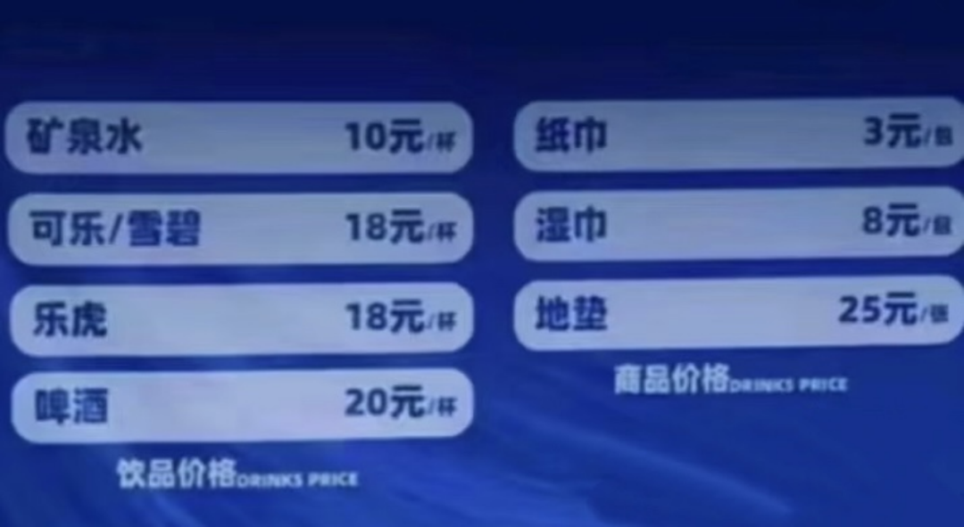 田兴摊位旁边有两个卖饮品的,矿泉水最便宜也要10元/瓶,可乐和雪碧18元/瓶,其他饮品都在30元左右。