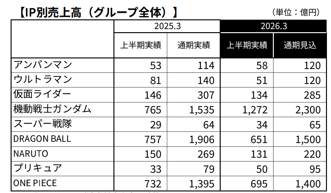 2025年4-9月半年期内,万代前三大IP《机动战士高达》《龙珠》《航海王》全线产品总收入达2618亿日元,占集团半年销售额的40%,集中度进一步上升。