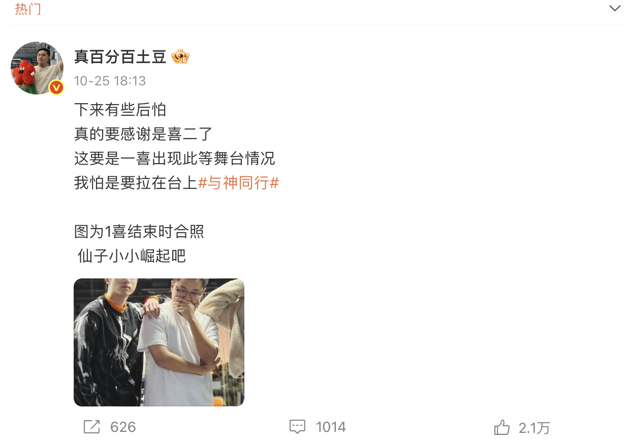 在土豆微博标签里,代表作后有一个形单影只的“无”,土豆直言自己还需要努力,可能还是需要长作品来更深刻地加深观众对他的认知,“或者我上次春晚。”土豆笑道,“如果我上春晚了,我把观众逗笑了,就一次,我就写上去,如果没把观众逗笑,我就不写。”