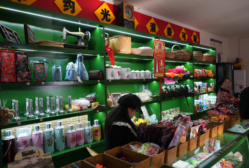 37岁的村民薛偏在村里开了一间复古怀旧风的杂货店,新中国第一款泡泡糖、承载着时光的麦乳精等、80年代的老式热水瓶……许多人记忆中的物件都能在这里找到。薛偏告诉界面新闻,之前自己也在外工作,但回村开店一直是她的愿望,“这里离家近,时间也相对自由。”