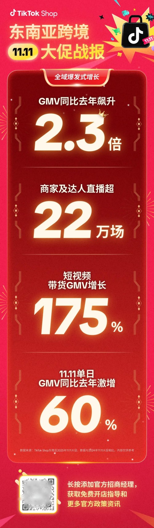 TikTok Shop东南亚跨境电商在刚刚结束的双11大促中实现全域爆发式增长。数据显示,今年双11大促,TikTok Shop东南亚跨境电商总交易额(GMV)对比去年双11,飙升2.3倍,以爆发态势领跑。