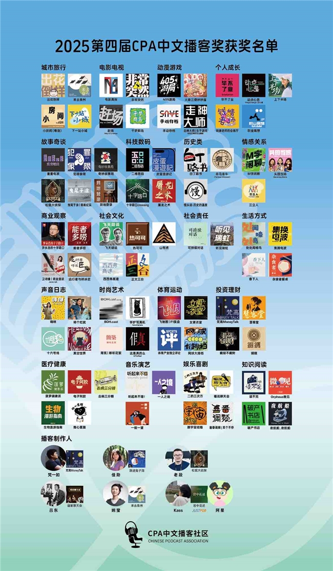 2025年的获奖制作人既有来自专业的播客机构,也有独立制作人。他们负责制作的作品既包含面向广大听众的免费节目,也有针对特定听友的付费节目,既有破案故事奇谈,也有城市文旅导览,既有声音特稿节目,也有品牌出品节目,体现了播客丰富多元的内容生态。