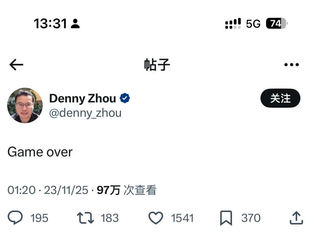 近日,谷歌DeepMind首席科学家、推理团队创始人Denny zhou发了一个帖子:Game over。