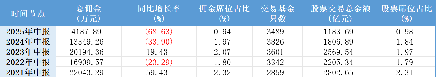 结合Choice数据,2025年上半年,国投证券仅录得基金分仓总佣金0.41亿元,同比减少接近7成,总佣金水平排名不仅较2024年底的第24位下滑至第30名,也是近五年来首次在上半年分仓佣金出现不足1亿元的情形,佣金席位占比也已不足1%。