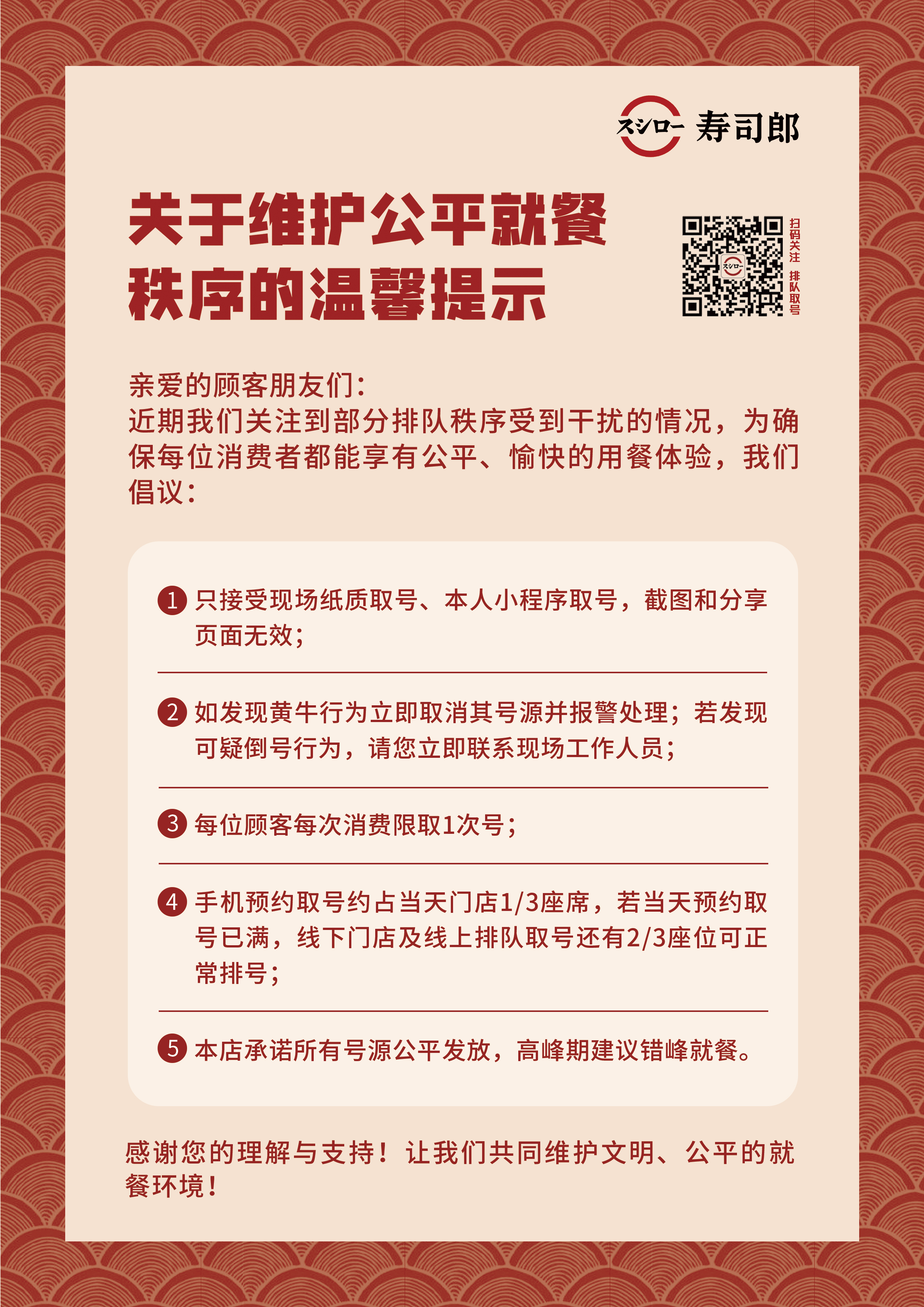 目前,寿司郎在其官方社交账号以及门店前都展示了一则维护就餐秩序的提示,包括只接受现场纸质取号、本人小程序取号,截图和分享页面无效;每位顾客每次消费限取一次号等。