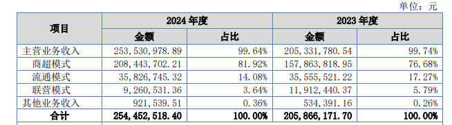 相比商超,流通模式的营收较为有限,占比不足总营收的2成,2023年、2024年,该渠道的收入始终徘徊在3500多万元,占比则从17.27%降至14.08%。
