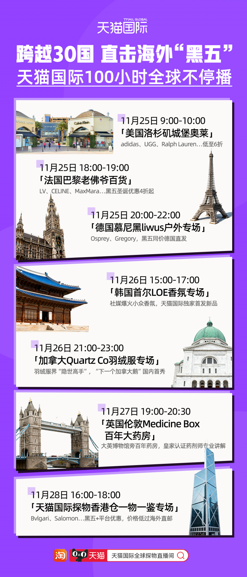 11月25日至30日,天猫国际1700多名全球购买手跨越美国洛杉矶、法国巴黎、英国伦敦、德国慕尼黑、韩国首尔、意大利米兰等30多个国家城市,开启100小时全球直播,为国内消费者提供边逛边买服务。