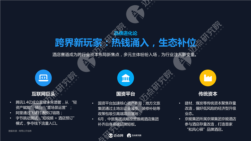 从新入局企业背景来看,酒店赛道成为跨行业资本布局新焦点,多元主体纷纷入场,为行业注入新变量。腾讯斥资1.4亿元成立星耀未来酒店管理公司,从“轻资产赋能”转向“重场景运营”;阿里通过飞猪打通预订链路,字节跳动测试“短视频+酒店预订”模式,争夺线下流量入口。此外,国资平台加速核心资产布局,地方文旅集团通过土地出让金减免、装修补贴等政策包吸引高端项目落地;建材、煤炭等传统资本则聚焦存量改造,这些跨界玩家的入场,正在重构酒店行业的生态格局。