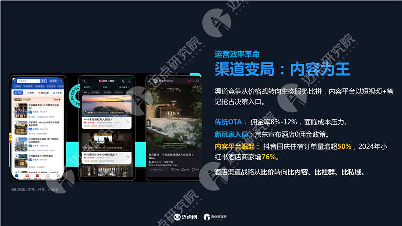 渠道变革是运营升级的重要一环,当前渠道竞争已从价格战转向生态服务比拼。对酒店而言,降本需求推动渠道选择变化,在行业利润承压期,酒店对低成本渠道需求迫切,京东“0佣金”模式正好契合这一需求。消费者行为变化同样影响渠道格局:年轻人偏好“看内容再预订”,抖音国庆住宿订单量增加50%,2024年小红书酒店商家也增长76%。内容平台成为新的流量入口。酒店渠道战略从比价转向比内容、比社群、比私域。