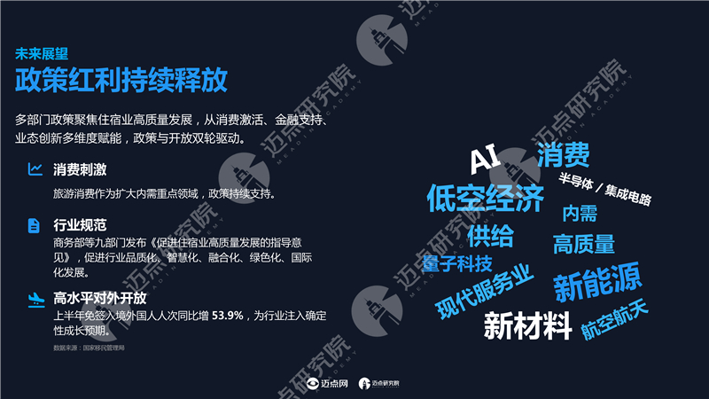 当前多部门政策聚焦住宿业高质量发展,从消费激活、金融支持、业态创新多维度为行业赋能。消费刺激方面,旅游消费作为扩大内需、带动消费的重要领域,多地出台文旅消费券、景区门票减免、酒店消费补贴等政策,2025年前三季度免签入境外国人1364万人次,占比71.2%,同比增长53.9%,入境旅游市场的复苏,为高端酒店带来新需求。行业规范方面,今年商务部等9部门联合发布《关于促进住宿业高质量发展的指导意见》,明确推动住宿业“品质化、智慧化、绿色化”发展,为行业转型指明方向,比如对绿色酒店的财政补贴、对智慧酒店的技术支持,都将加速行业升级。开放政策持续加码,入境免签范围扩大、跨境支付便利化,将进一步推动旅游酒店市场复苏,政策红利的持续释放,将为酒店行业提供稳定的发展环境。